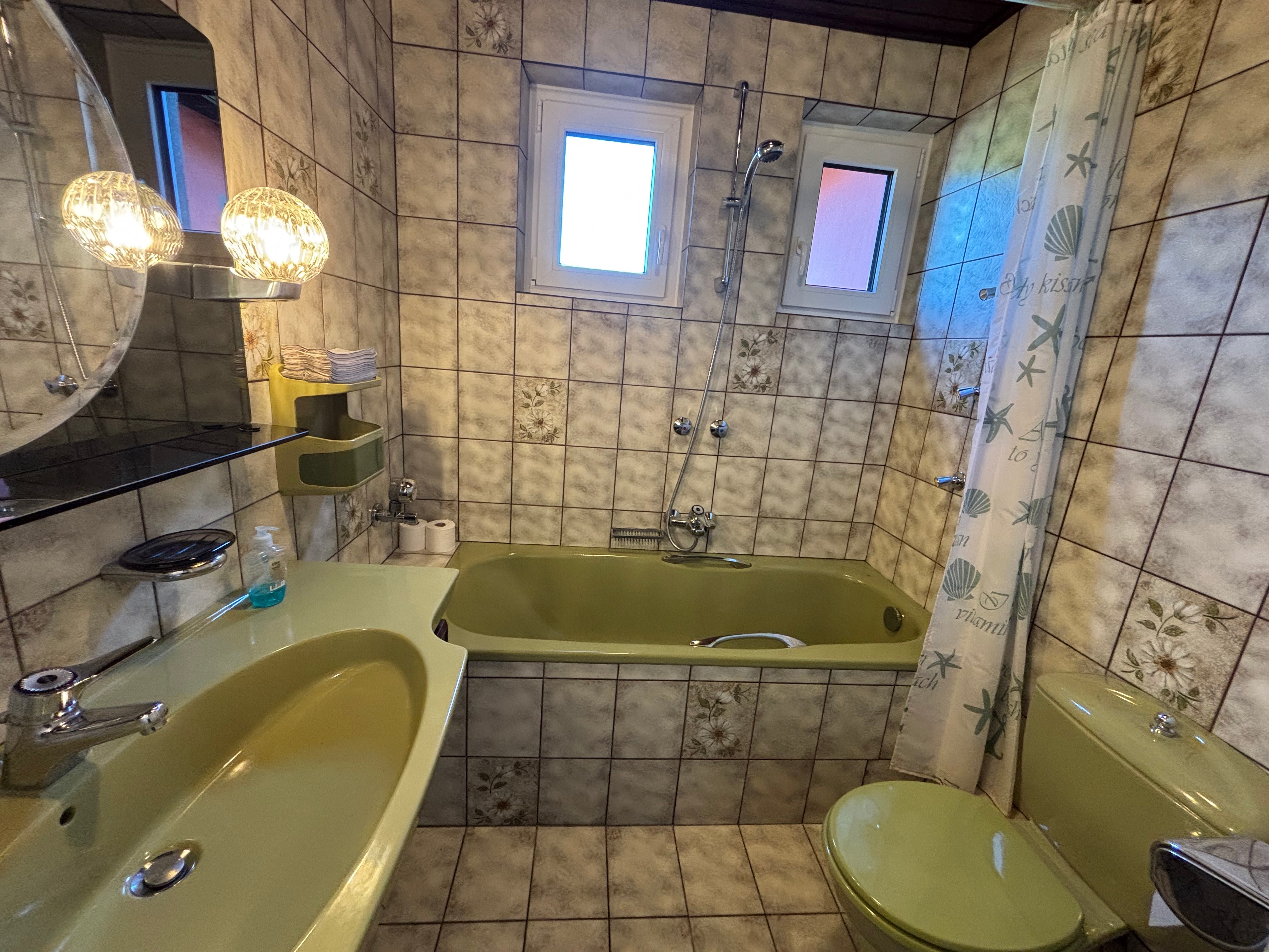 • Bad mit Wannen-/Duschbad, zusätzlicher Körper-Duscharmatur und zwei Außenfenstern zur Belüftung