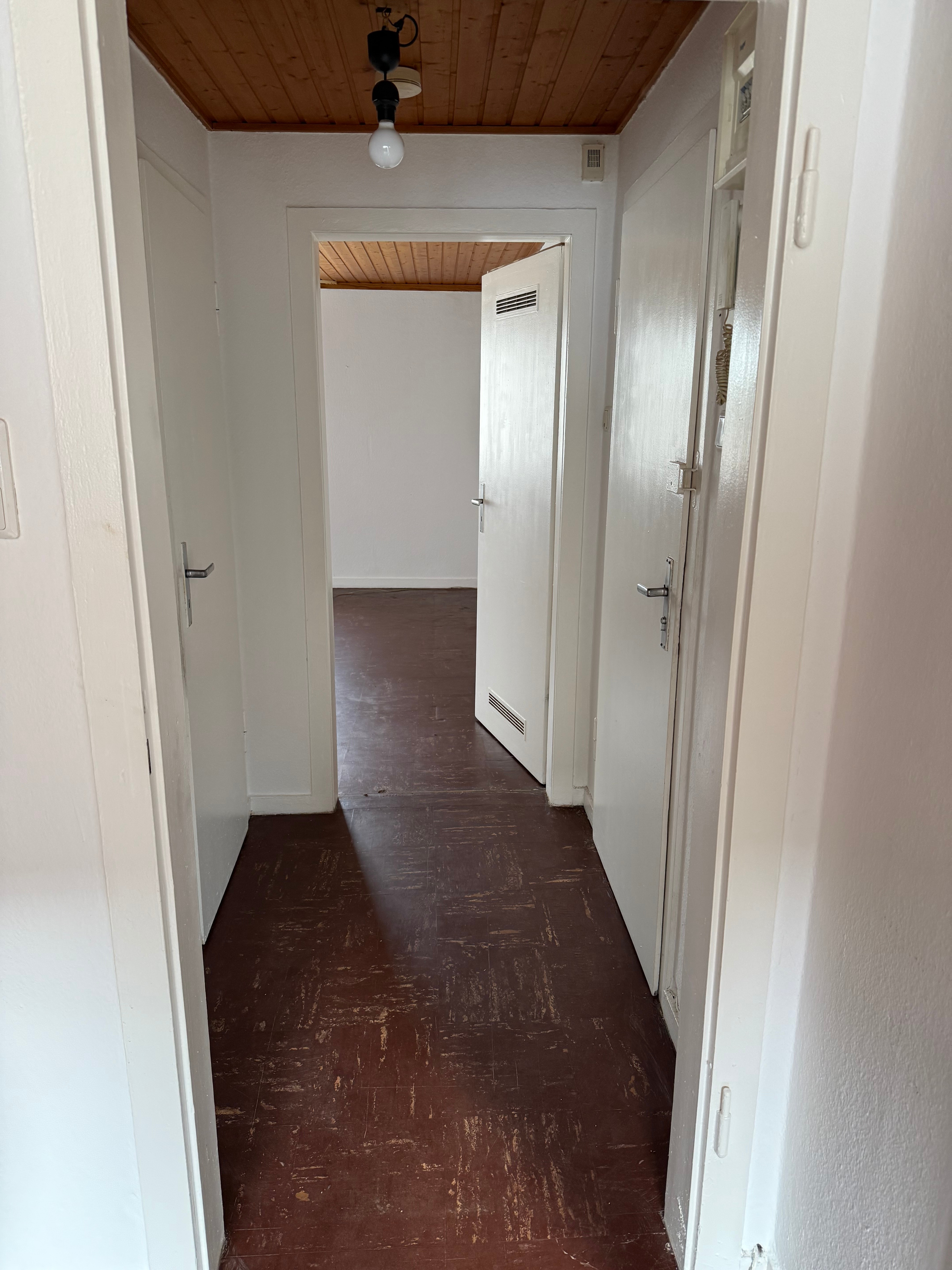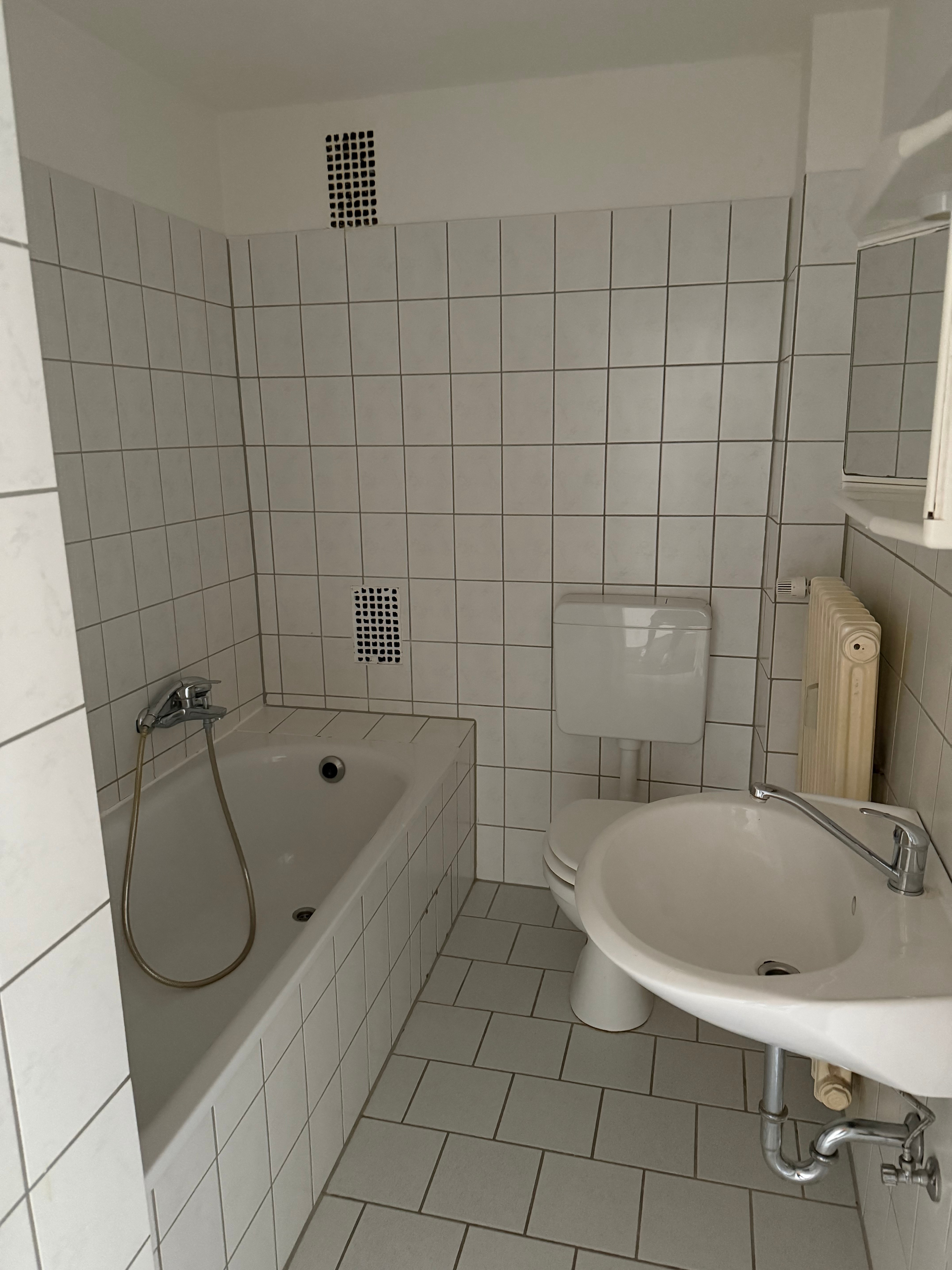 Beim Betreten der Wohnung gelangt man durch den Flur in den hellen Wohnbereich, der genug Platz für eine gemütliche Sitzecke bietet. Das Schlafzimmer ist ausreichend groß, um ein komfortables Doppelbett sowie einen Kleiderschrank unterzubringen. Das Badezimmer ist mit einer Badewanne, einem Waschbecken und einem WC ausgestattet.