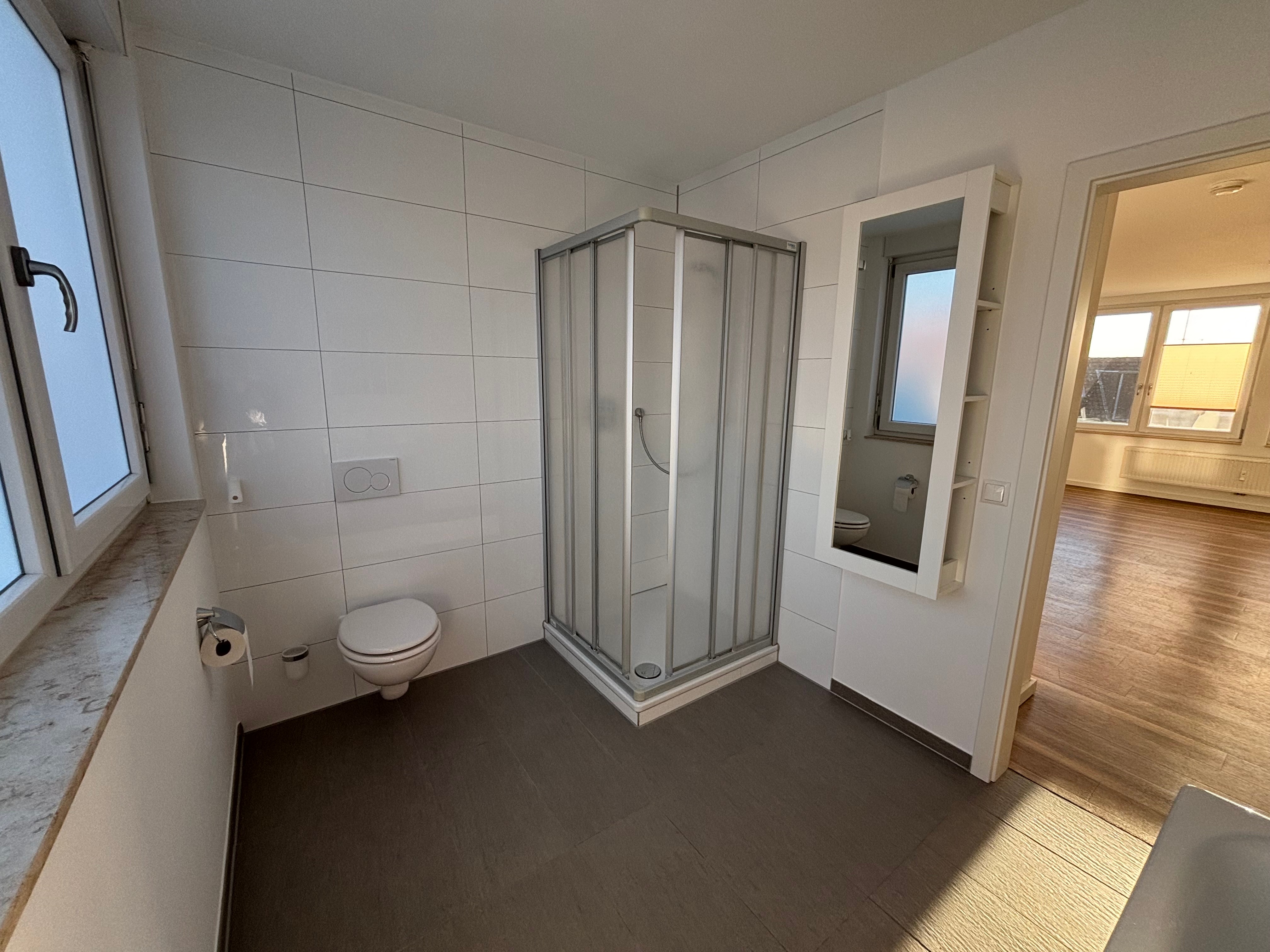 Das Herzstück der Wohnung bildet das geräumige Wohnzimmer, das ausreichend Platz für eine gemütliche Sitzecke bietet. Die angrenzende offene Küche ist funktional ausgestattet und verfügt über genügend Stauraum. Ein helles Schlafzimmer sowie ein Badezimmer mit Dusche runden das Platzangebot ab.