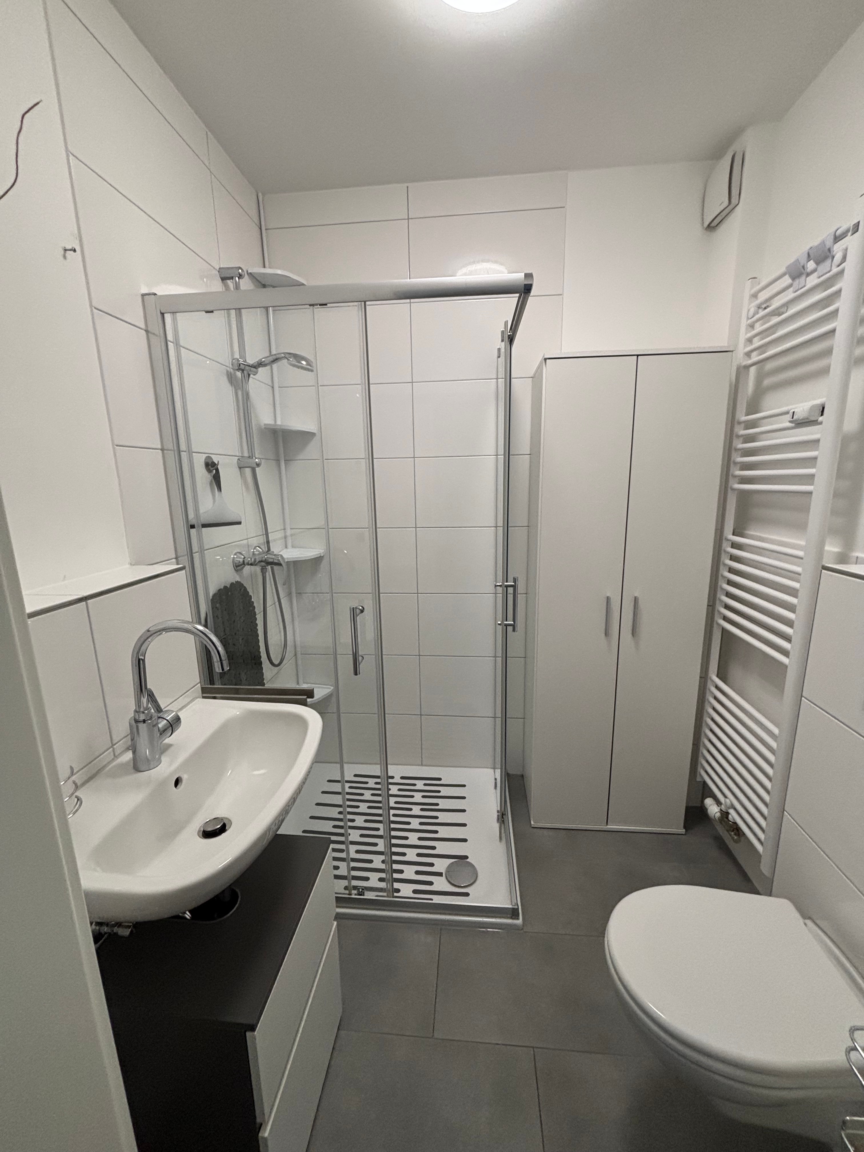 Beim Betreten der Wohnung wird man von einem großzügigen Wohnzimmer empfangen, das viel Tageslicht durch die großen Fensterfronten hereinlässt. Die angrenzende Küche ist funktional und bietet genügend Platz zum Kochen und Essen. Die Küche kann vom Vormieter gegen eine Abstandssumme übernommen werden. Das Hauptschlafzimmer ist gemütlich und ruhig, während das zweite Schlafzimmer oder Büro vielseitig genutzt werden kann. Das Badezimmer verfügt über eine Dusche und bietet Entspannungsmöglichkeiten nach einem langen Tag.